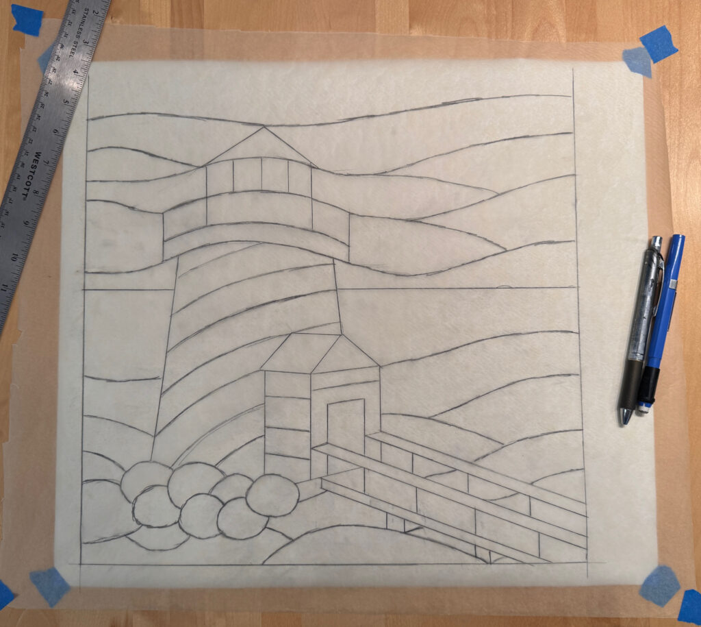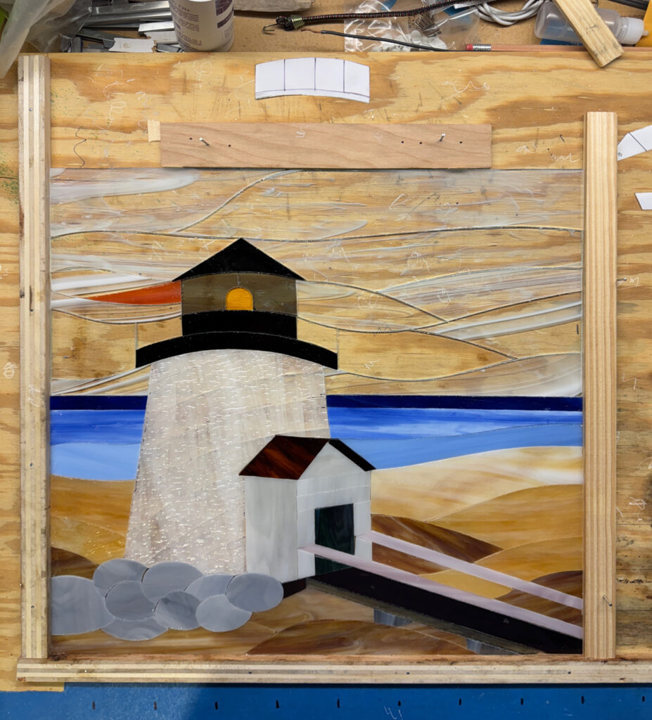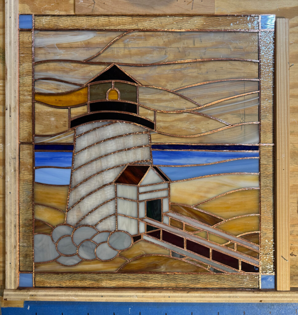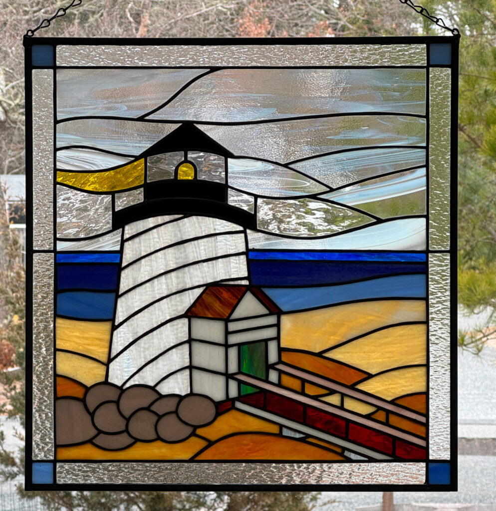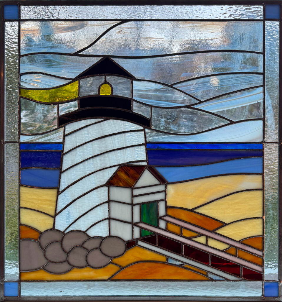 Thought I’d join the party, though it took me a bit of time to envision how a lighthouse might be rendered in stained glass. The medium provides very limited opportunity for detail (blades of grass are definitely out), as are individual dimples in the sand. But things like a jumble of rocks are in, color variations in the sand, the water, and the sky are definitely in. I suppose that’s the creative process.
