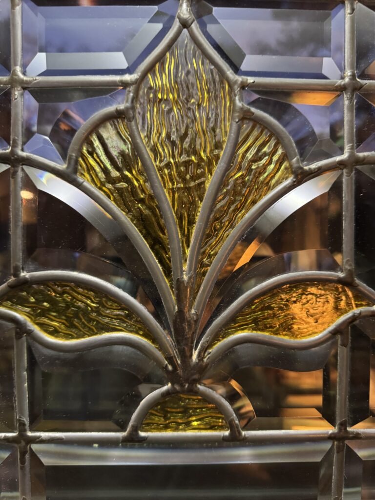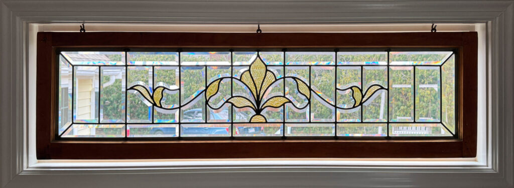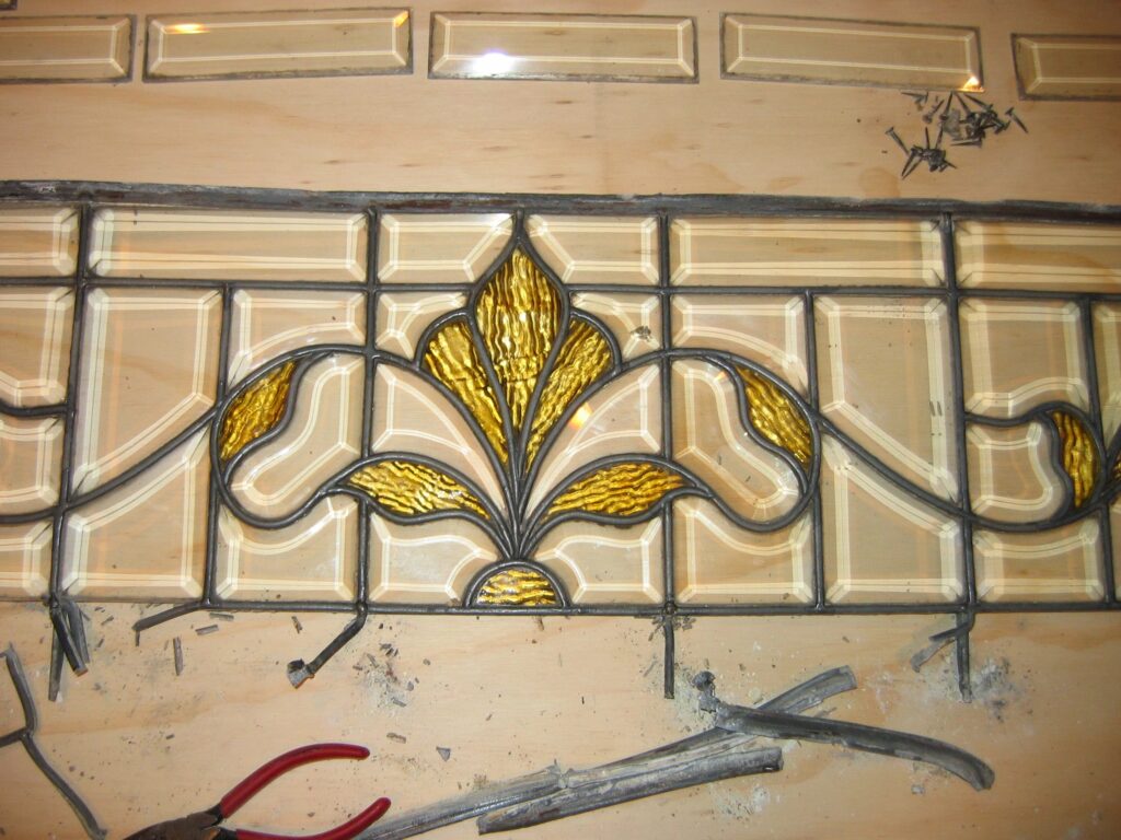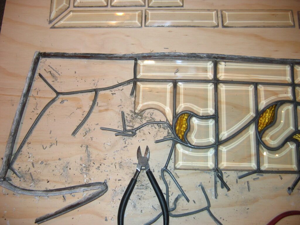 This project was a restoration effort. The piece was suffering from age – the lead and “goo” (the technical term for the stuff which holds the glass firmly in the lead caming channels) was failing, leaving the window susceptible to breakage and/or loss of the custom pieces.